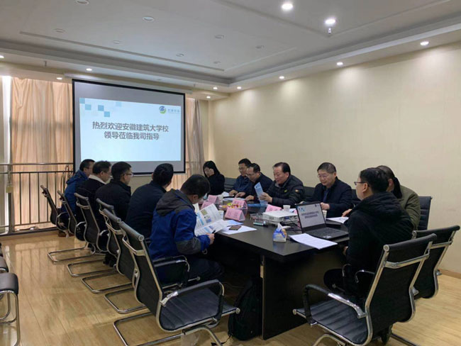 2021年2月6日,安徽建筑大學黨委黨委、副校長蔡新立教授,攜經管學院院長潘和平教授、成果轉化中心仲勇副主任(主持工作)、環能學院副院長朱曙光教授、科技處副處長謝發之教授、經管學院帥英副書記、科技處趙強教授、環能學院孫柏副教授蒞臨我公司考察交流。公司董事長查宏偉、總經理石臺全程陪同考察交流。