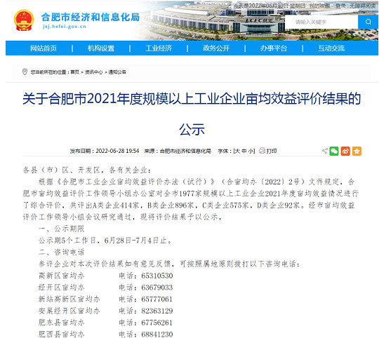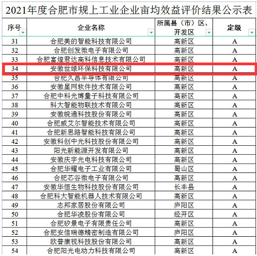 不以規模定標準,而以“畝均論英雄”。近日,根據《合肥市工業企業畝均效益評價辦法(試行)》(合畝均辦〔2022〕2號)文件規定,合肥市畝均效益評價工作領導小組辦公室對全市1977家規模以上工業企業2021年度畝均效益情況進行了綜合評價,共評出A類企業414家,B類企業896家,C類企業575家,D類企業92家。經市畝均效益評價工作領導小組會議研究通過,將評價結果予以公示。安徽世綠環保科技有限公司在此次綜合評價中,被評為A級。